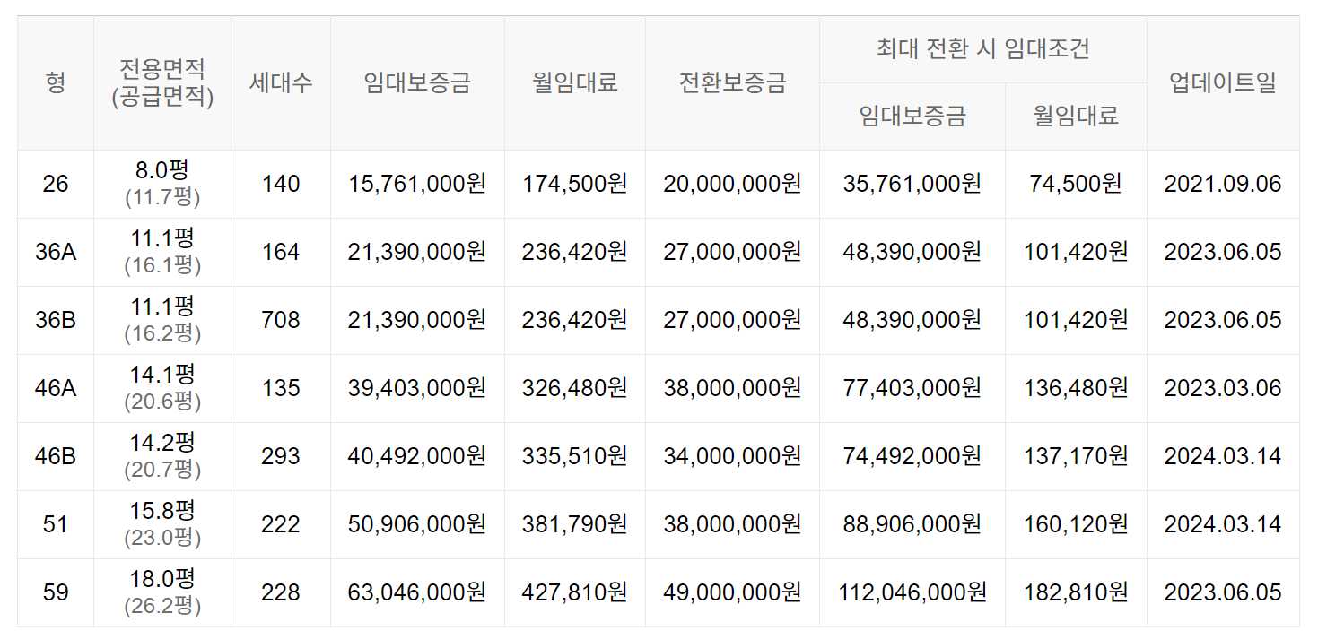 임대보증금 및 월 임대료는 입주자 모집공고일 기준이며, 보증금 최대 전환 시 변동될 수 있습니다.