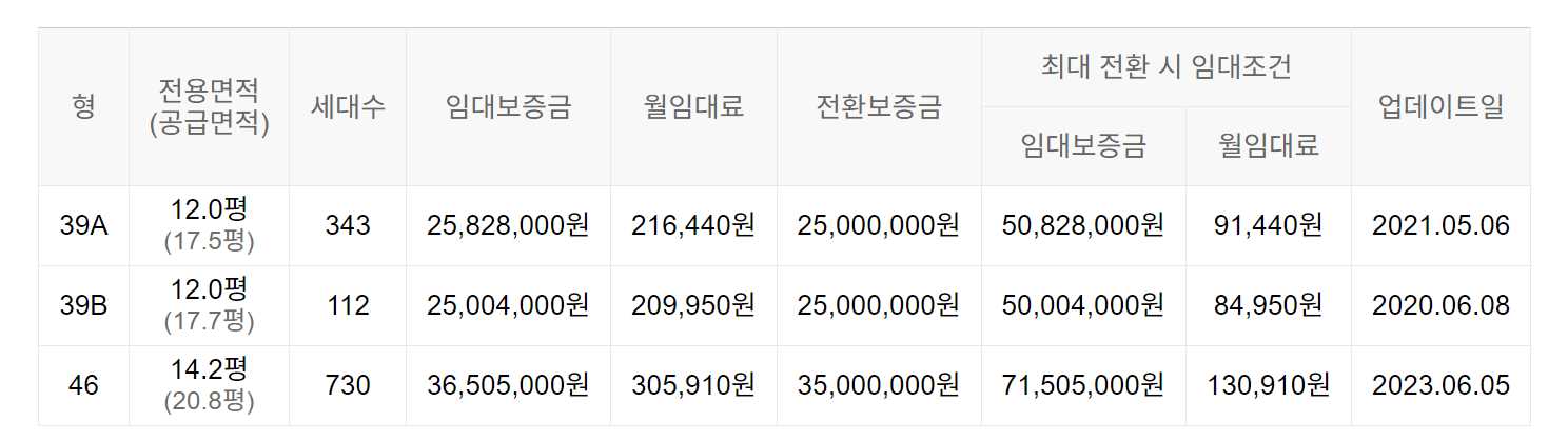 임대보증금 및 월 임대료는 입주자 모집공고일 기준이며, 보증금 최대 전환 시 변동될 수 있습니다.