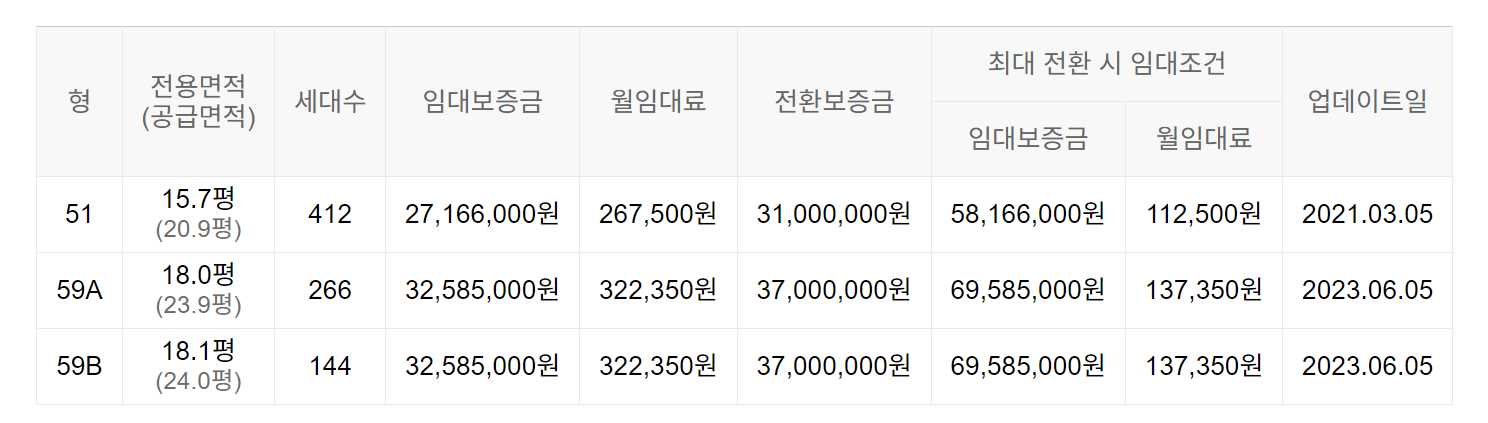 임대보증금 및 월 임대료는 입주자 모집공고일 기준이며, 보증금 최대 전환 시 변동될 수 있습니다.