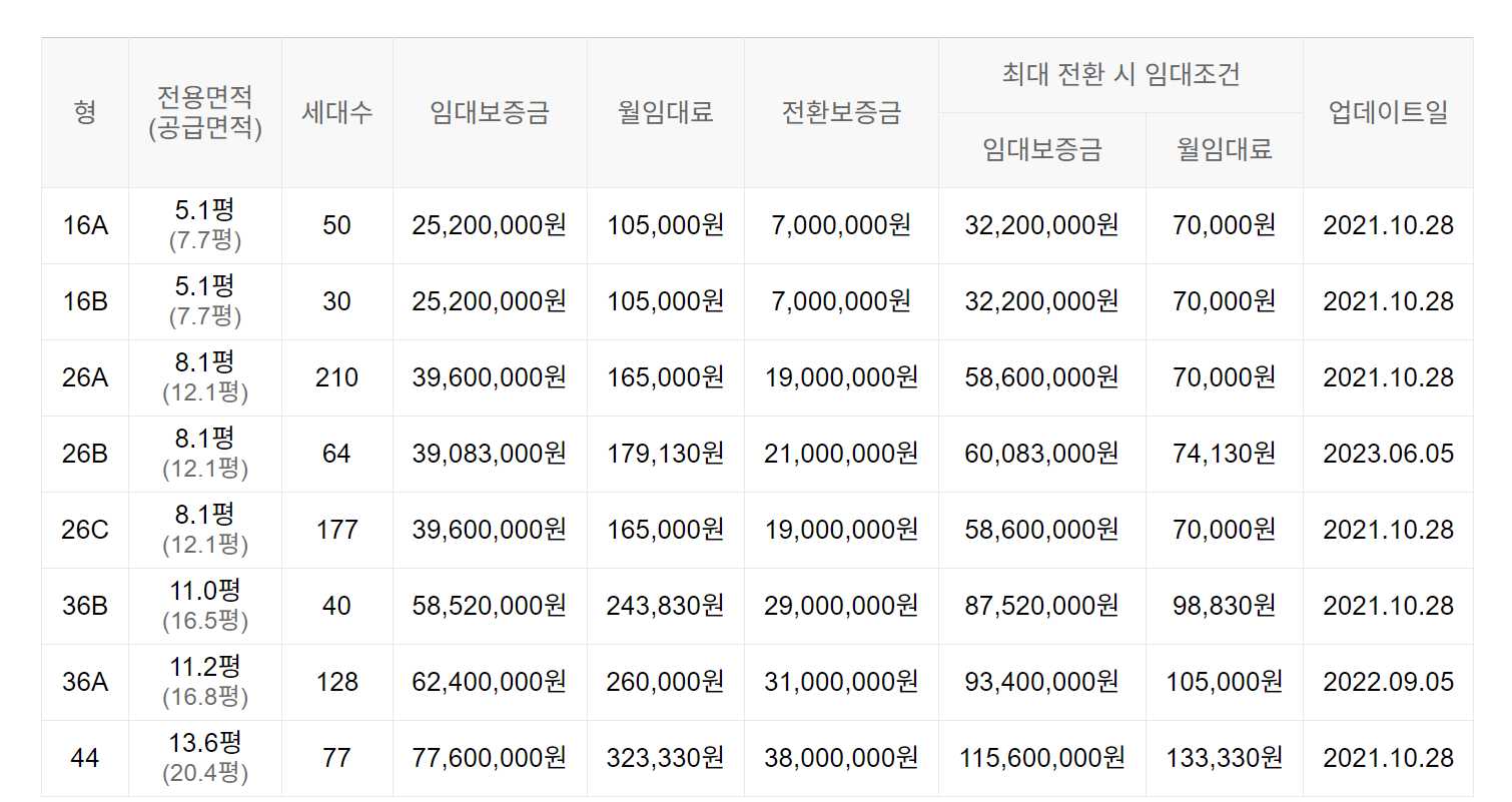 임대보증금 및 월 임대료는 입주자 모집공고일 기준으로 보증금 최대 전환 시 변동될 수 있습니다.
