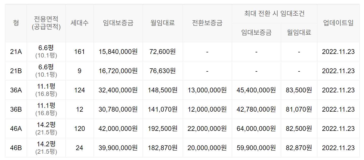 임대보증금 및 월 임대료는 입주자 모집공고일 기준으로 보증금 최대 전환 시 변동될 수 있습니다.