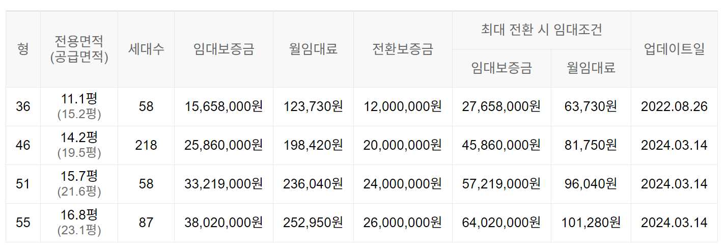 임대보증금 및 월 임대료는 입주자 모집공고일 기준이며, 보증금 최대 전환 시 변동될 수 있습니다.