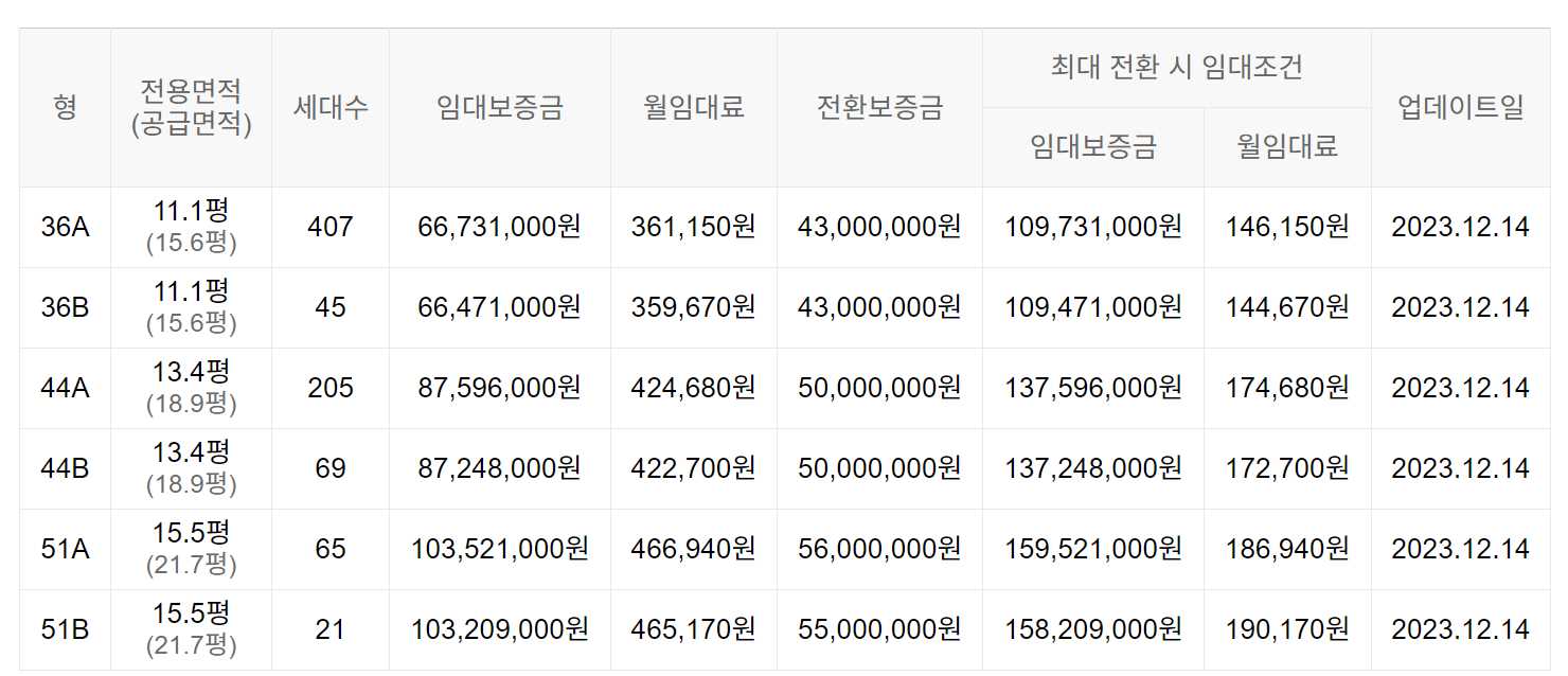 임대보증금 및 월 임대료는 입주자 모집공고일 기준이며, 보증금 최대 전환 시 변동될 수 있습니다.