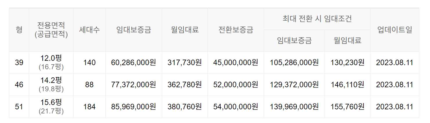 임대보증금 및 월 임대료는 입주자 모집공고일 기준이며, 보증금 최대 전환 시 변동될 수 있습니다.