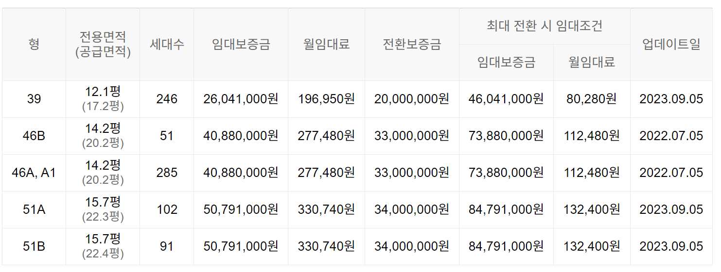 임대보증금 및 월 임대료는 입주자 모집공고일 기준이며, 보증금 최대 전환 시 변동될 수 있습니다.