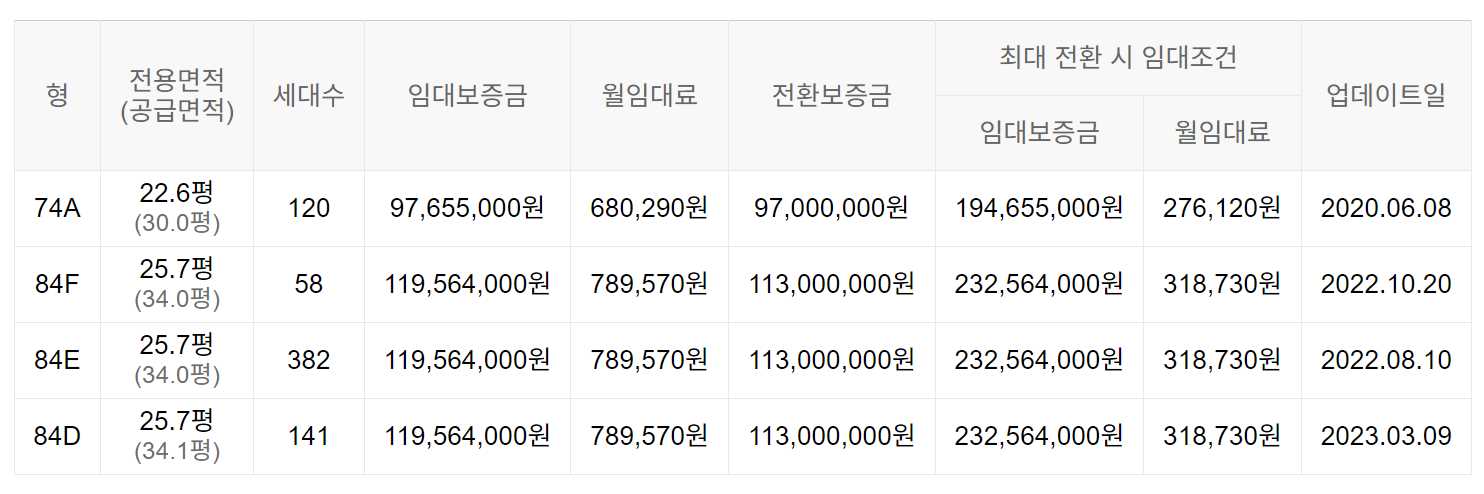 임대보증금 및 월 임대료는 입주자 모집공고일 기준이며, 보증금 최대 전환 시 변동될 수 있습니다.