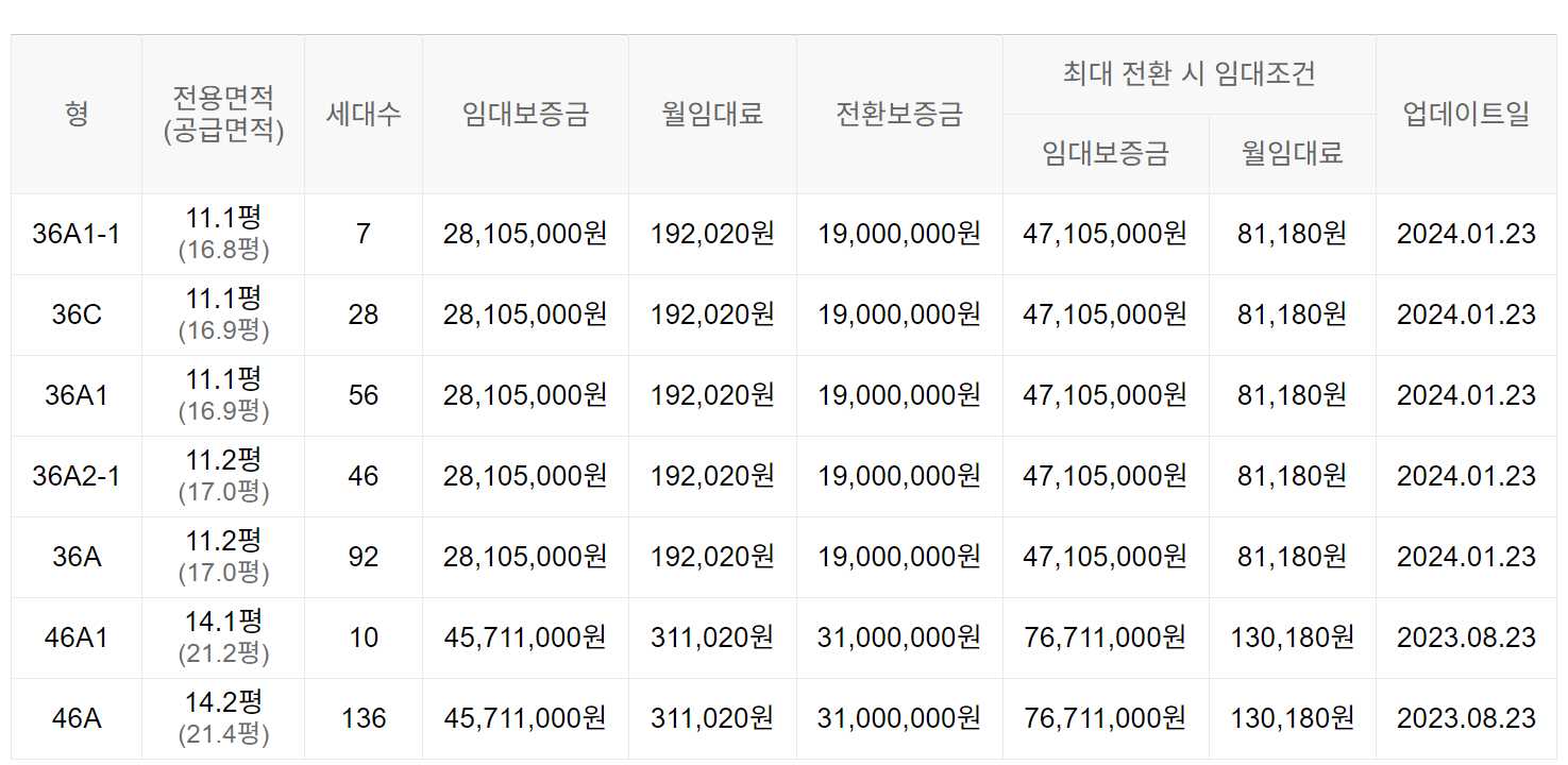 임대보증금 및 월 임대료는 입주자 모집공고일 기준이며, 보증금 최대 전환 시 변동될 수 있습니다.