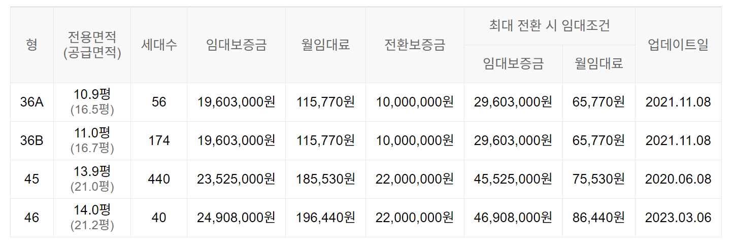 임대보증금 및 월 임대료는 입주자 모집공고일 기준이며, 보증금 최대 전환 시 변동될 수 있습니다.