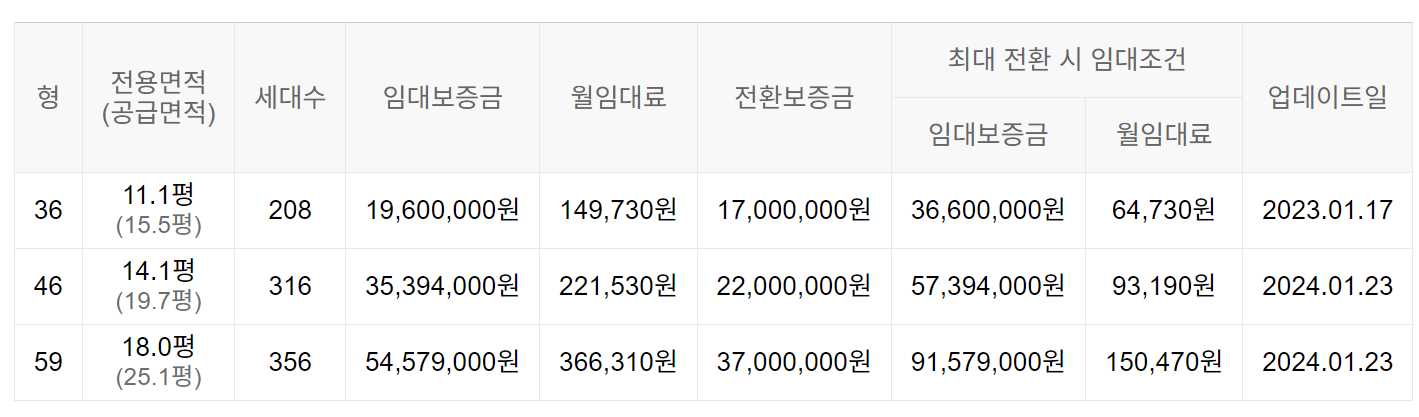 임대보증금 및 월 임대료는 입주자 모집공고일 기준이며, 보증금 최대 전환 시 변동될 수 있습니다.