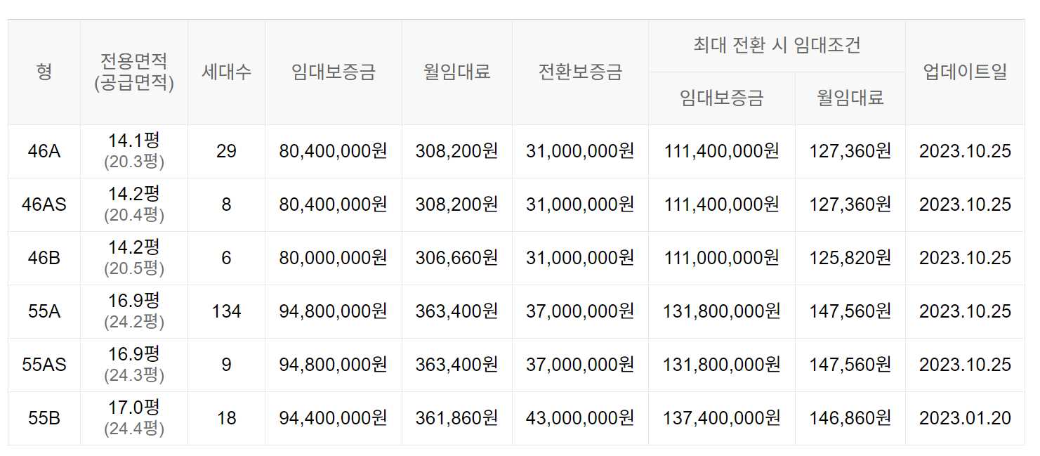 임대보증금 및 월 임대료는 입주자 모집공고일 기준으로 보증금 최대 전환 시 변동될 수 있습니다.