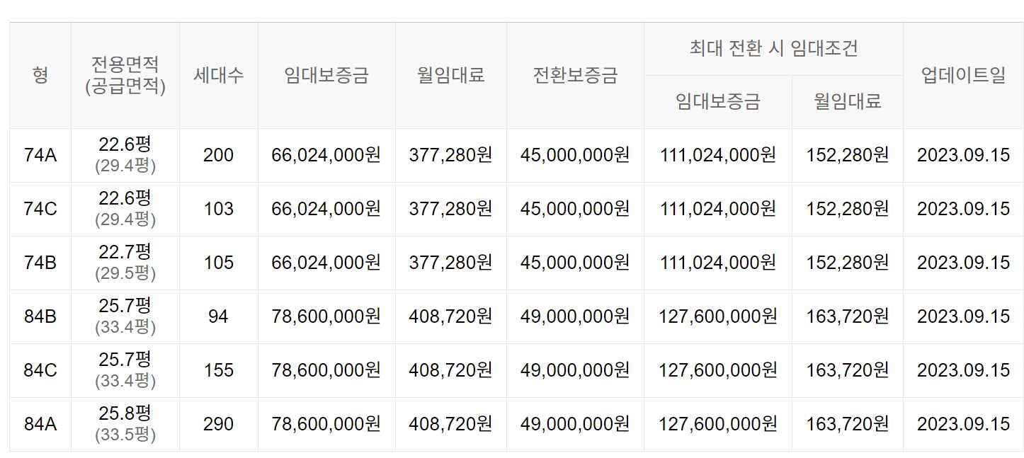 임대보증금 및 월 임대료는 입주자 모집공고일 기준이며, 보증금 최대 전환 시 변동될 수 있습니다.