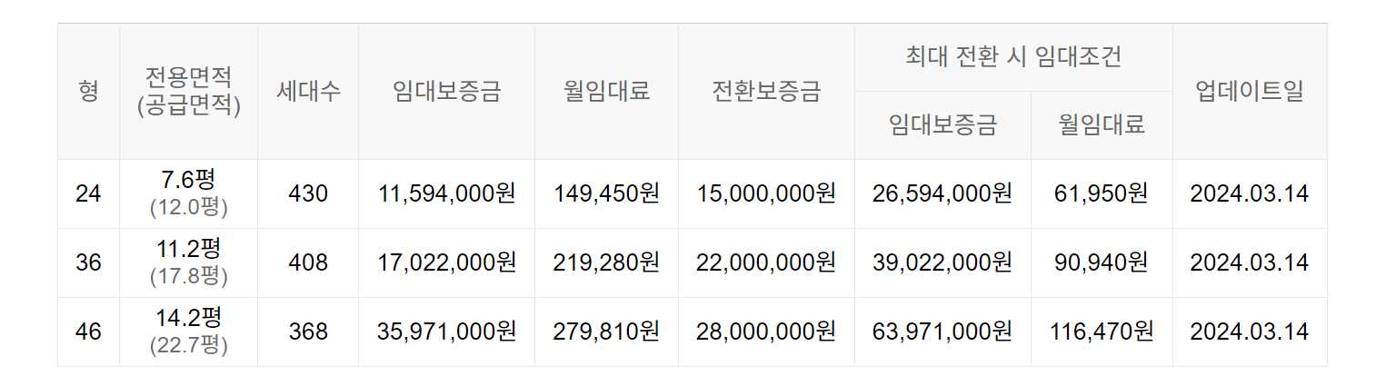 임대보증금 및 월 임대료는 입주자 모집공고일 기준이며, 보증금 최대 전환 시 변동될 수 있습니다.
