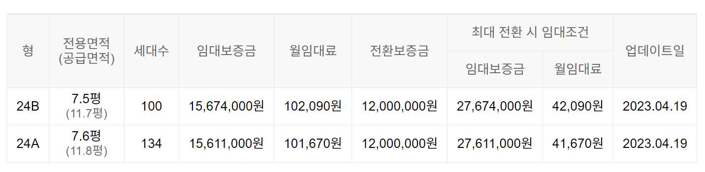 임대보증금 및 월 임대료는 입주자 모집공고일 기준이며, 보증금 최대 전환 시 변동될 수 있습니다.