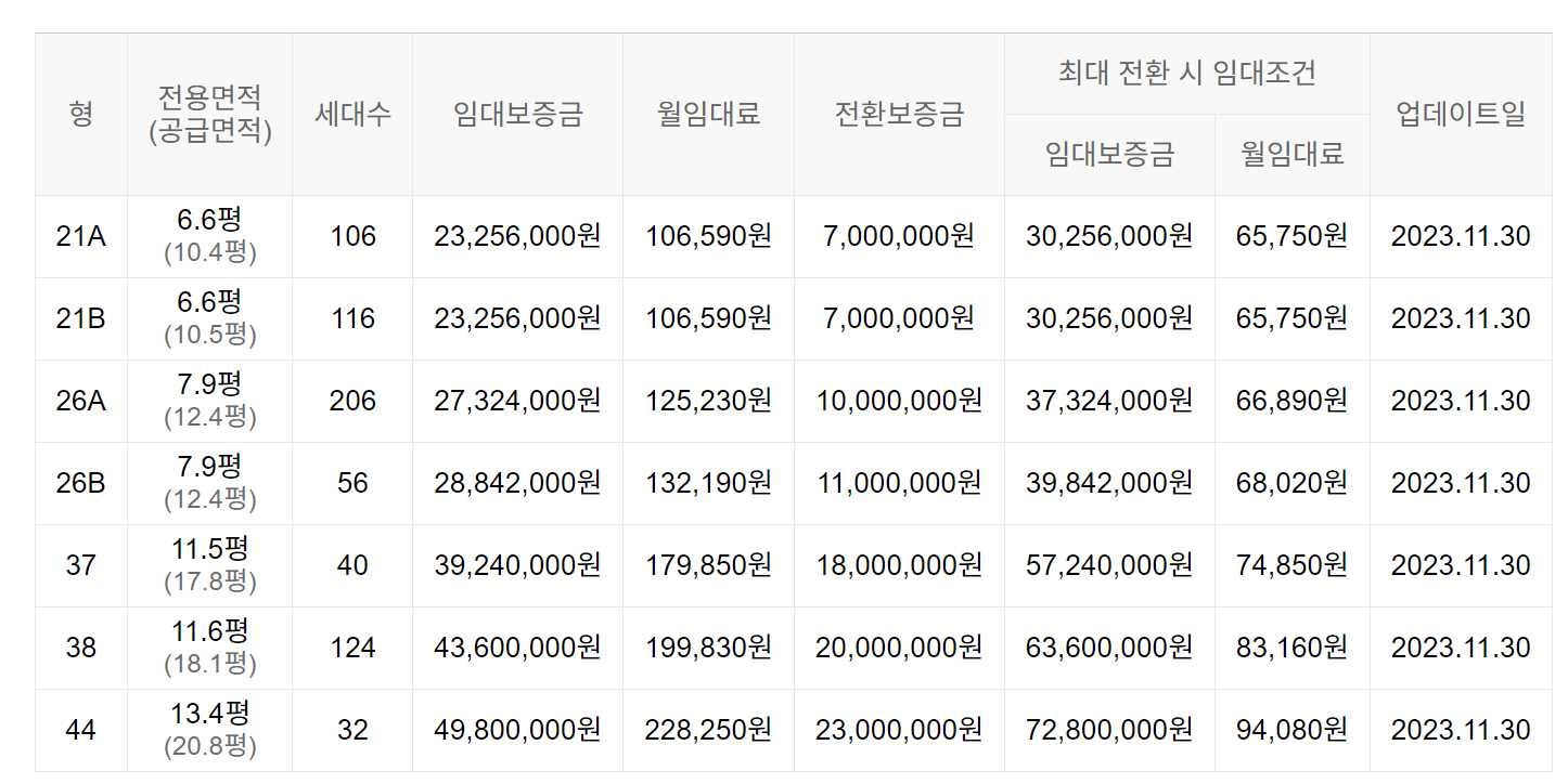임대보증금 및 월 임대료는 입주자 모집공고일 기준으로 보증금 최대 전환 시 변동될 수 있습니다.
