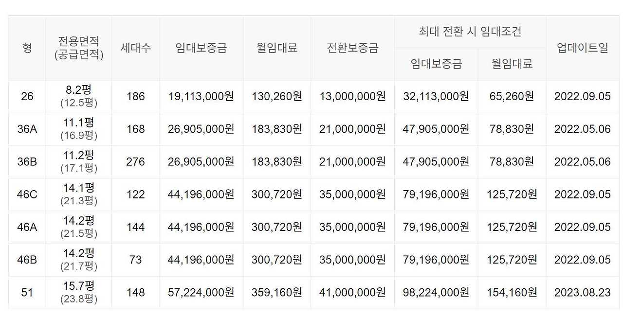 임대보증금 및 월 임대료는 입주자 모집공고일 기준이며, 보증금 최대 전환 시 변동될 수 있습니다.