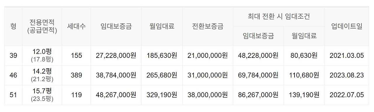 임대보증금 및 월 임대료는 입주자 모집공고일 기준이며, 보증금 최대 전환 시 변동될 수 있습니다.