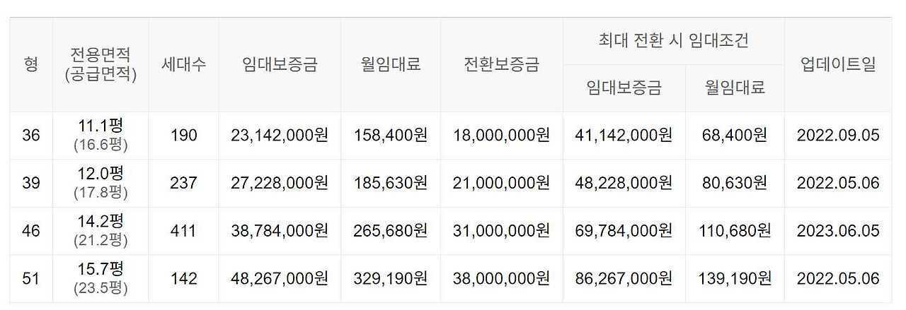 임대보증금 및 월 임대료는 입주자 모집공고일 기준이며, 보증금 최대 전환 시 변동될 수 있습니다.