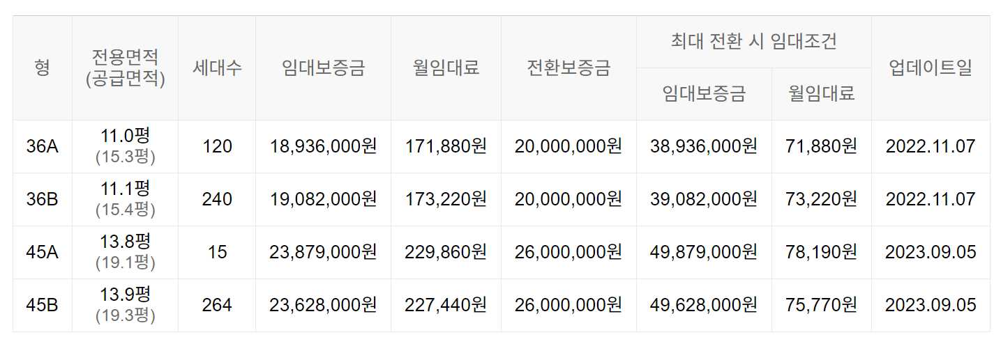 임대보증금 및 월 임대료는 입주자 모집공고일 기준이며, 보증금 최대 전환 시 변동될 수 있습니다.