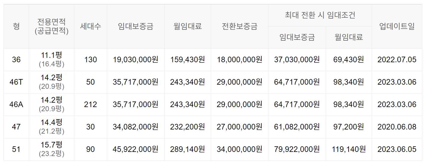 임대보증금 및 월 임대료는 입주자 모집공고일 기준이며, 보증금 최대 전환 시 변동될 수 있습니다.