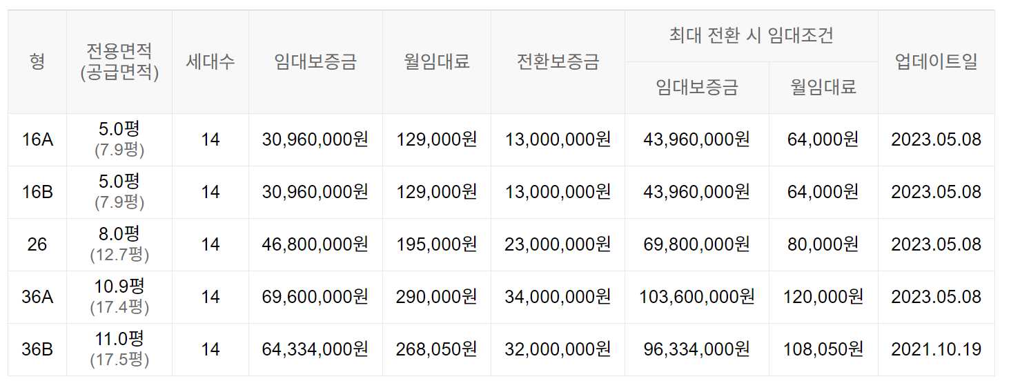 임대보증금 및 월 임대료는 입주자 모집공고일 기준으로 보증금 최대 전환 시 변동될 수 있습니다.