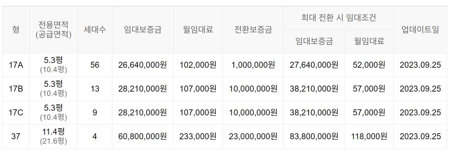 임대보증금 및 월 임대료는 입주자 모집공고일 기준으로 보증금 최대 전환 시 변동될 수 있습니다.