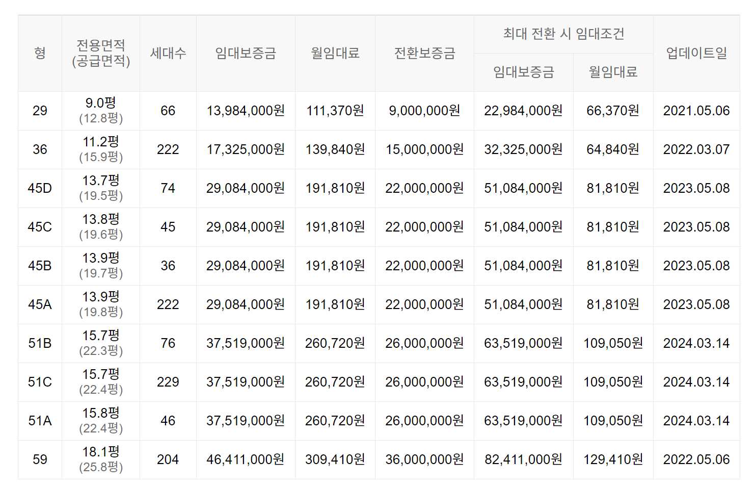 임대보증금 및 월 임대료는 입주자 모집공고일 기준이며, 보증금 최대 전환 시 변동될 수 있습니다.