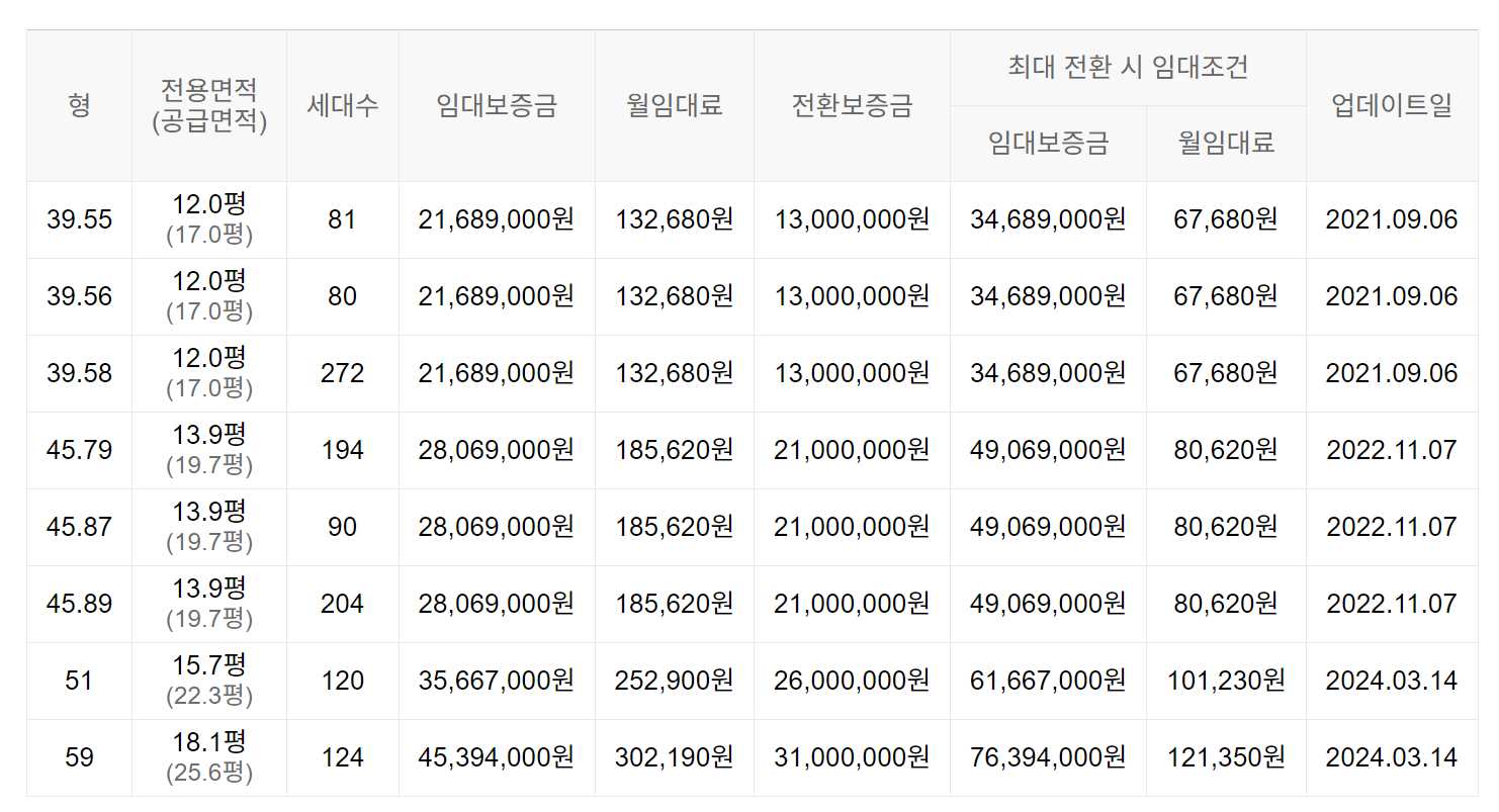 임대보증금 및 월 임대료는 입주자 모집공고일 기준이며, 보증금 최대 전환 시 변동될 수 있습니다.