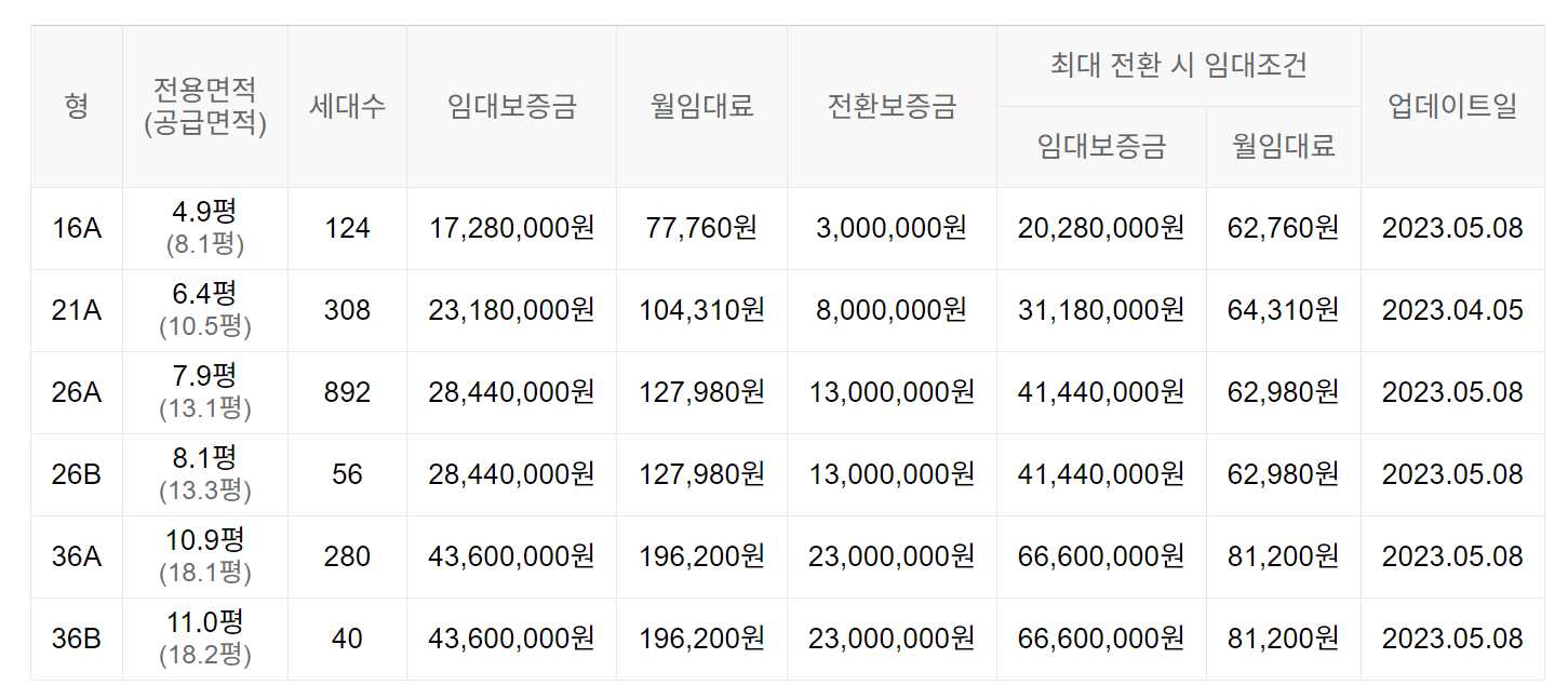 임대보증금 및 월 임대료는 입주자 모집공고일 기준으로 보증금 최대 전환 시 변동될 수 있습니다.