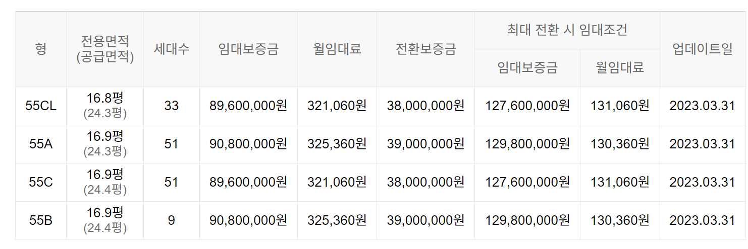 임대보증금 및 월 임대료는 입주자 모집공고일 기준으로 보증금 최대 전환 시 변동될 수 있습니다.