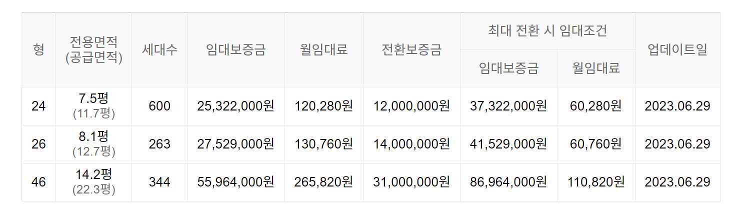 임대보증금 및 월 임대료는 입주자 모집공고일 기준으로 보증금 최대 전환 시 변동될 수 있습니다.