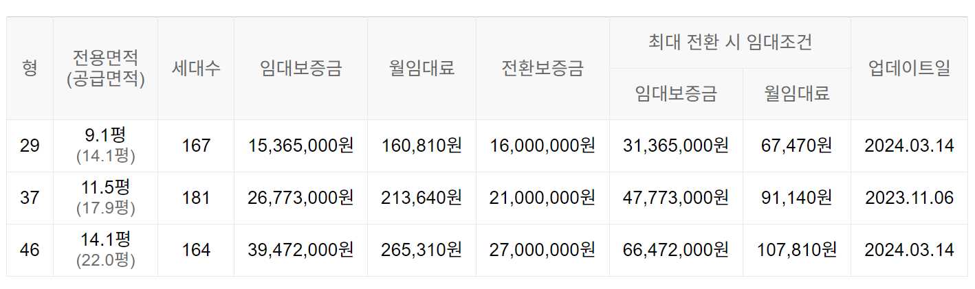 임대보증금 및 월 임대료는 입주자 모집공고일 기준이며, 보증금 최대 전환 시 변동될 수 있습니다.