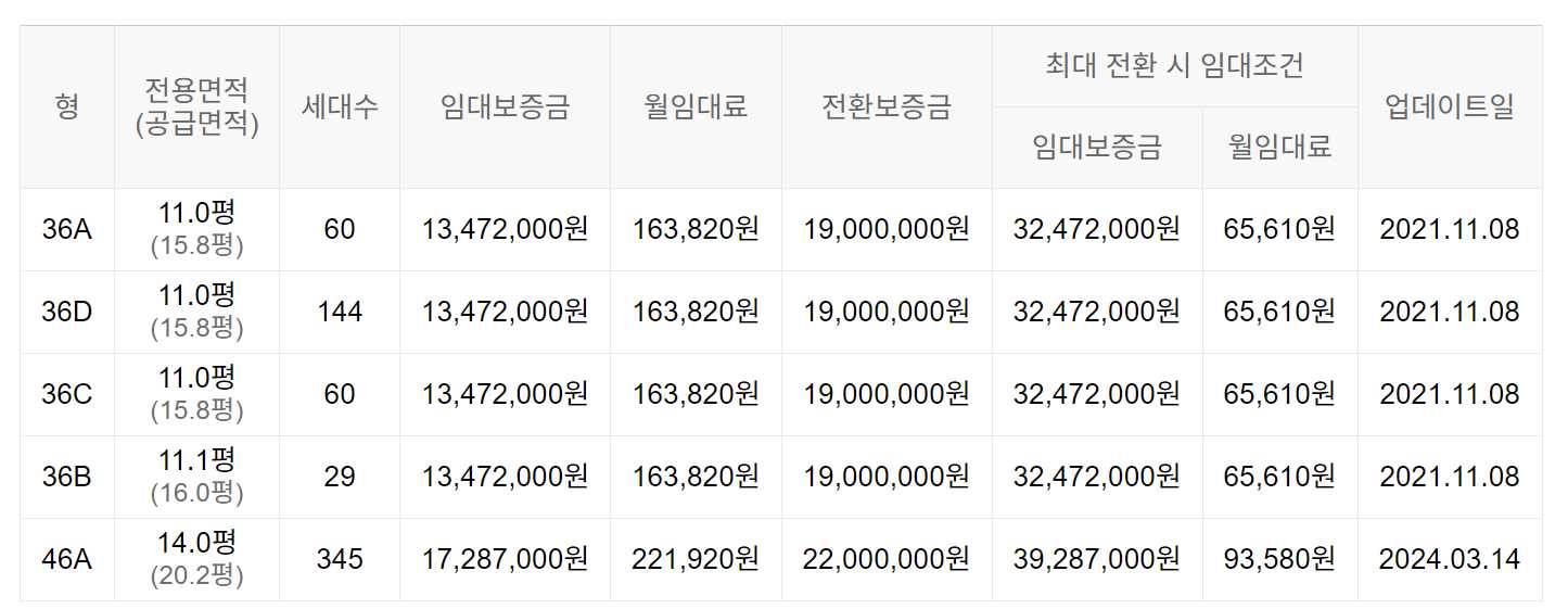 임대보증금 및 월 임대료는 입주자 모집공고일 기준이며, 보증금 최대 전환 시 변동될 수 있습니다.