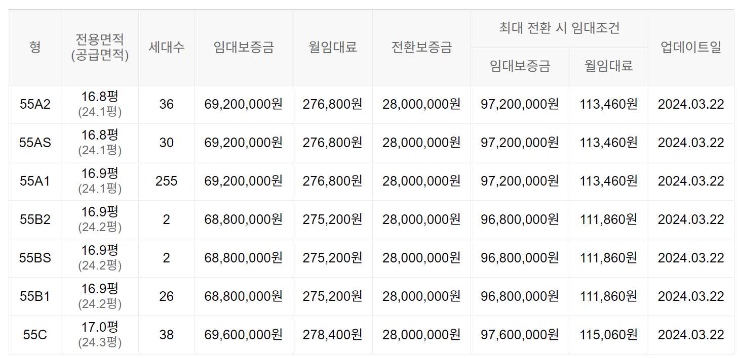 임대보증금 및 월 임대료는 입주자 모집공고일 기준으로 보증금 최대 전환 시 변동될 수 있습니다.