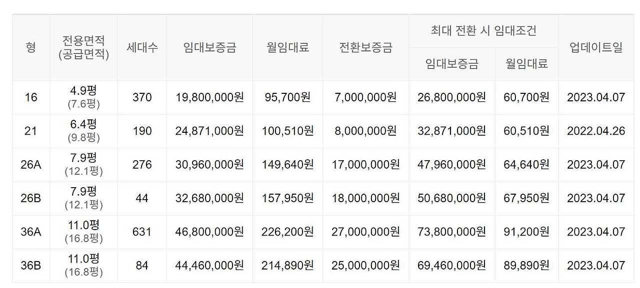 임대보증금 및 월 임대료는 입주자 모집공고일 기준으로 보증금 최대 전환 시 변동될 수 있습니다.