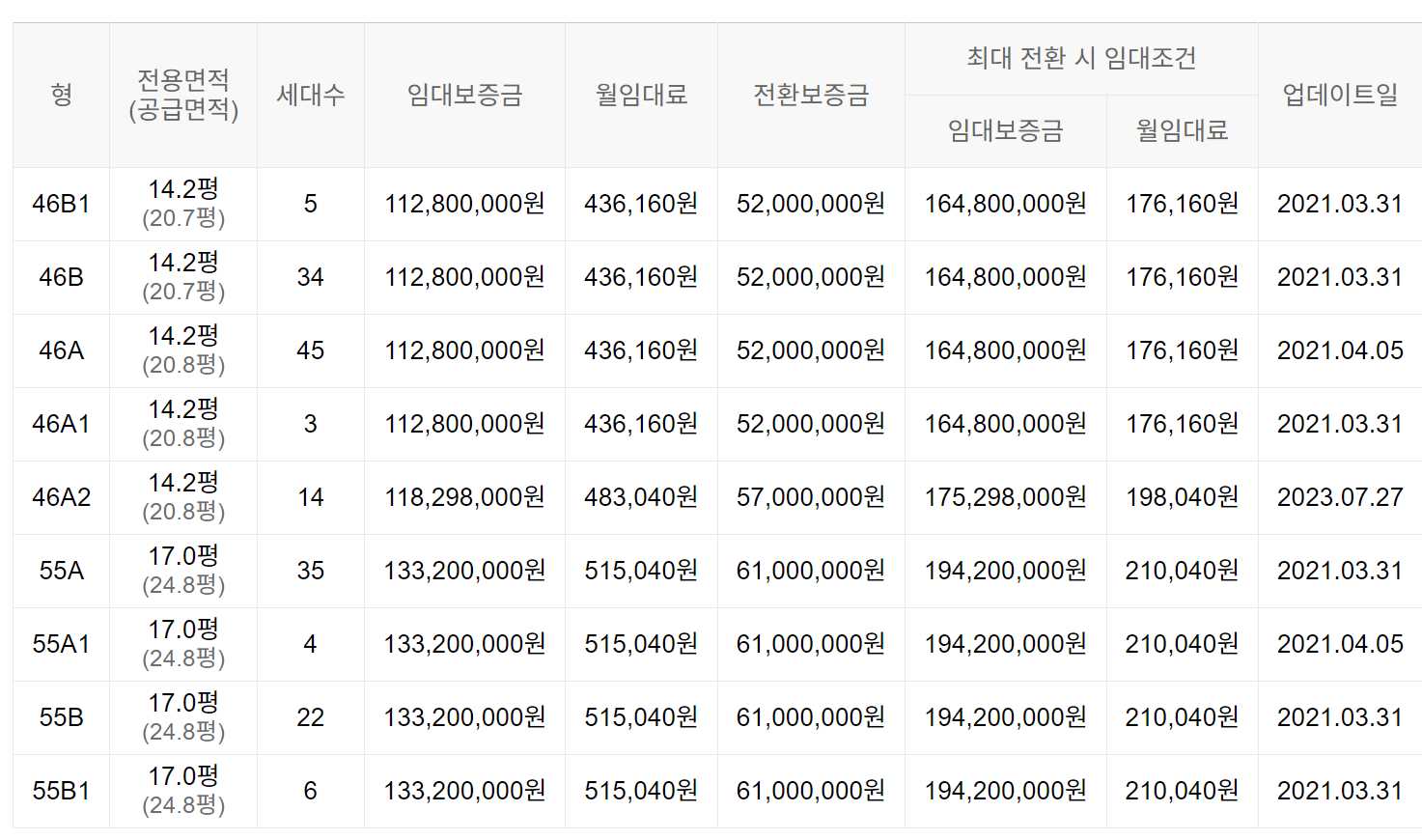 임대보증금 및 월 임대료는 입주자 모집공고일 기준으로 보증금 최대 전환 시 변동될 수 있습니다.
