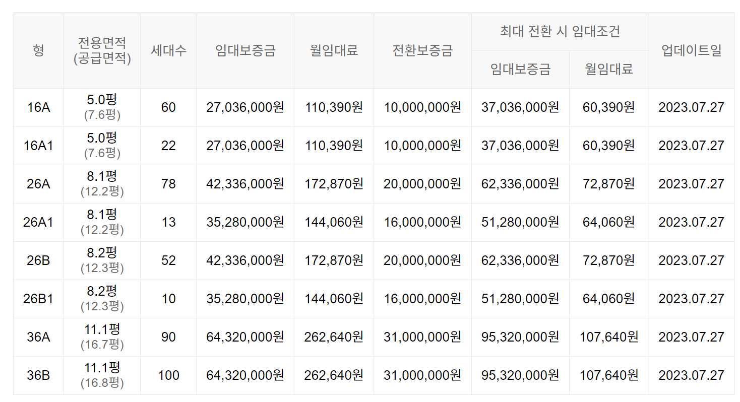 임대보증금 및 월 임대료는 입주자 모집공고일 기준으로 보증금 최대 전환 시 변동될 수 있습니다.