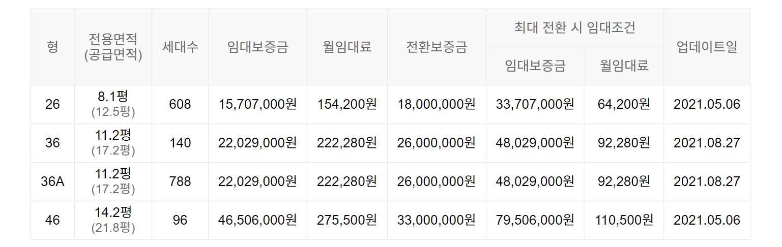 임대보증금 및 월 임대료는 입주자 모집공고일 기준이며, 보증금 최대 전환 시 변동될 수 있습니다.