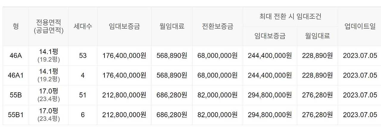 임대보증금 및 월 임대료는 입주자 모집공고일 기준으로 보증금 최대 전환 시 변동될 수 있습니다.