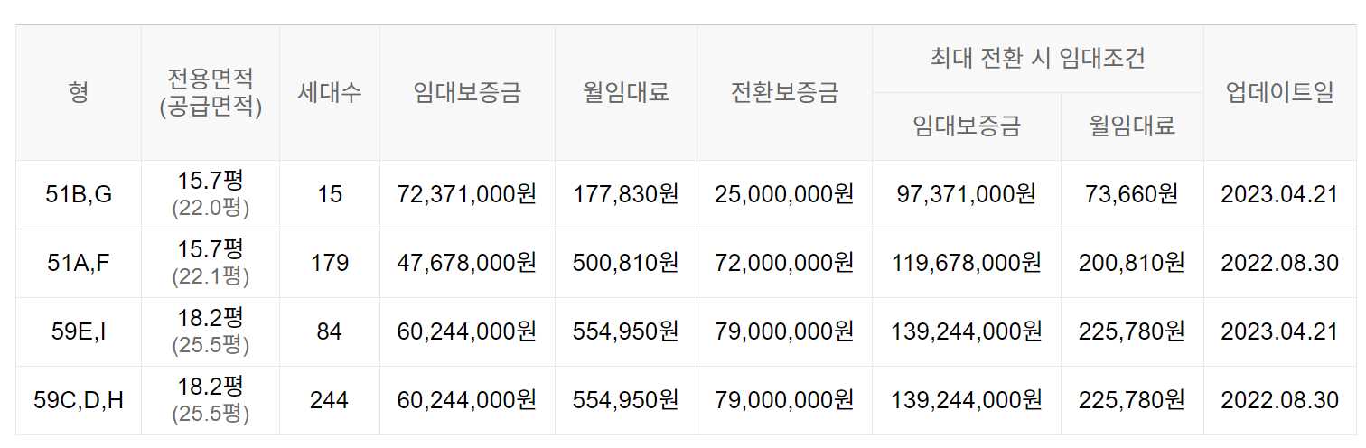 임대보증금 및 월 임대료는 입주자 모집공고일 기준이며, 보증금 최대 전환 시 변동될 수 있습니다.