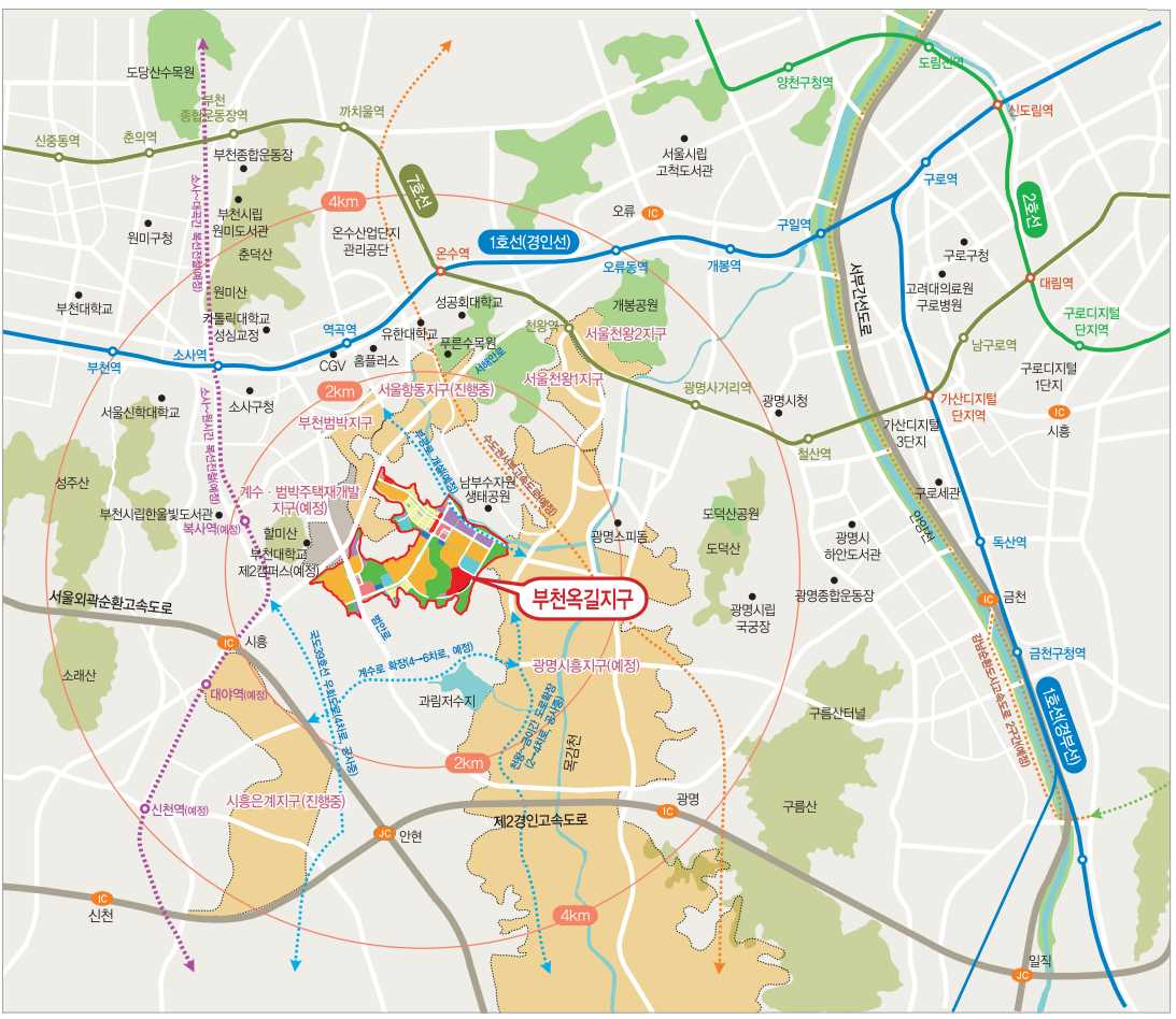 LH옥길센트럴힐은 1호선 역곡역(3.2km), 인근에 초중, 도서관 등이 지역에 위치하고 있습니다.