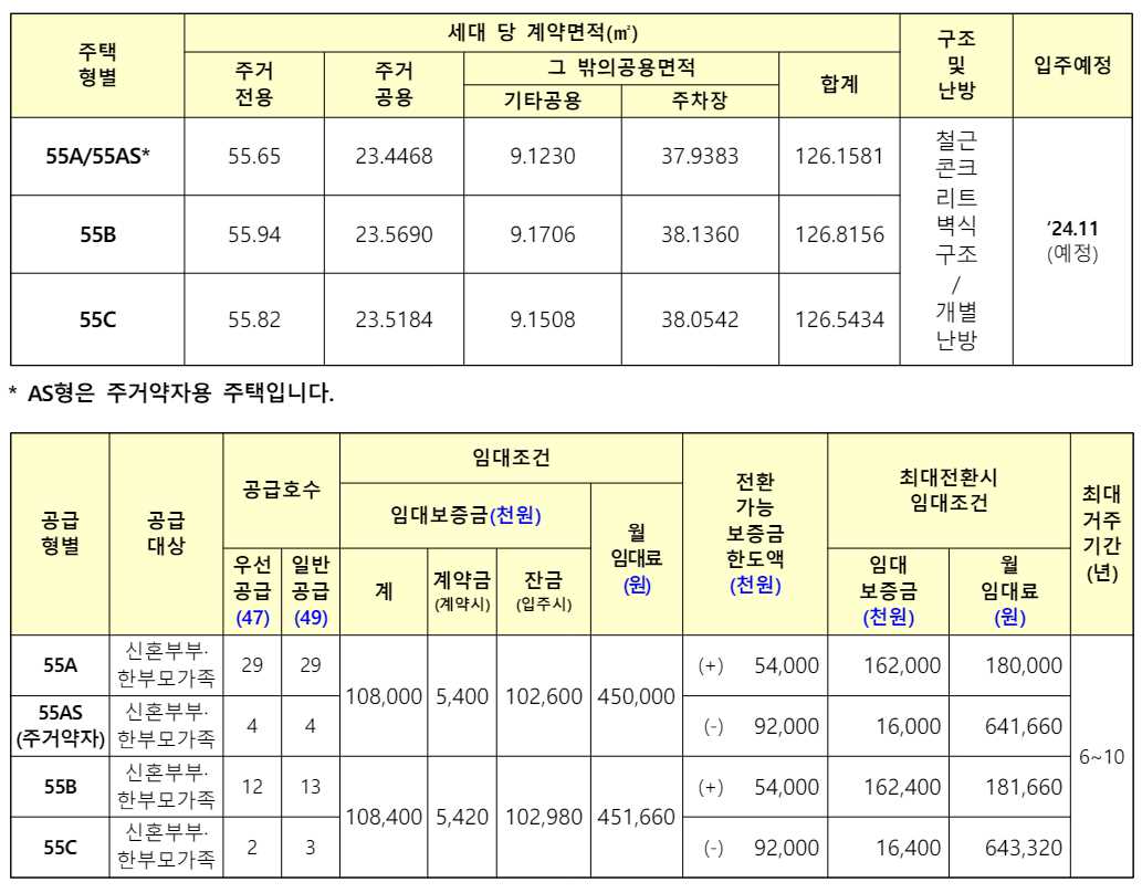 임대보증금 및 월 임대료는 입주자 모집공고일 기준으로 보증금 최대 전환 시 변동될 수 있습니다.