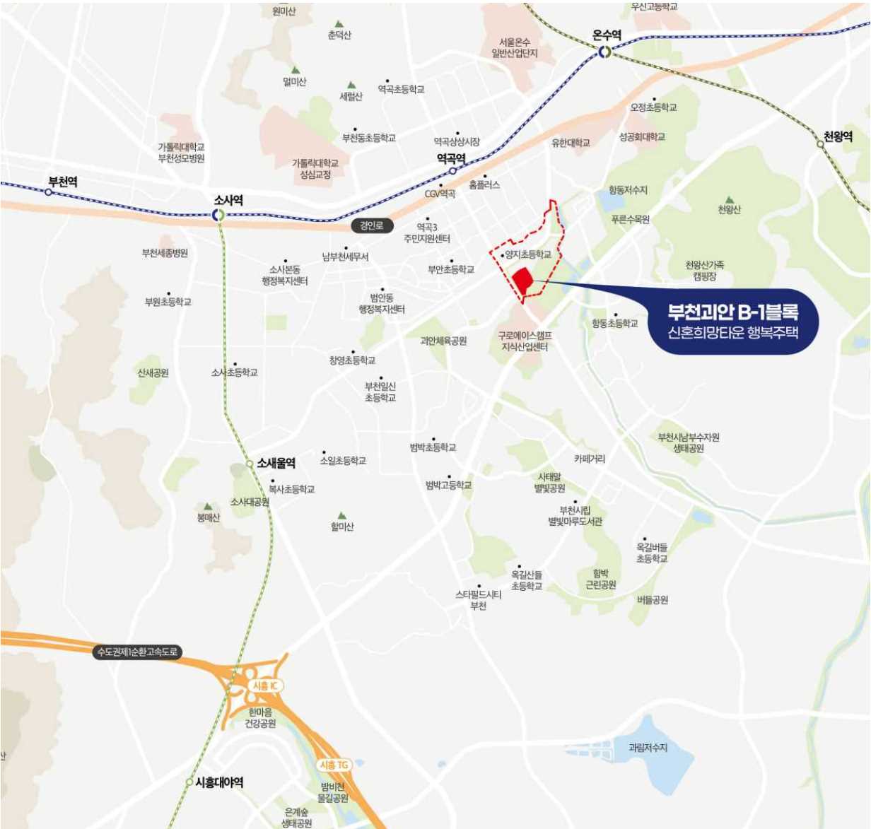 부천괴안B-1은 1호선 역곡역 800m, 천왕산 근처에 있으며, 인근에 초중고, 도서관, 마트 등 다양한 편의시설을 갖춘 지역에 위치하고 있습니다.