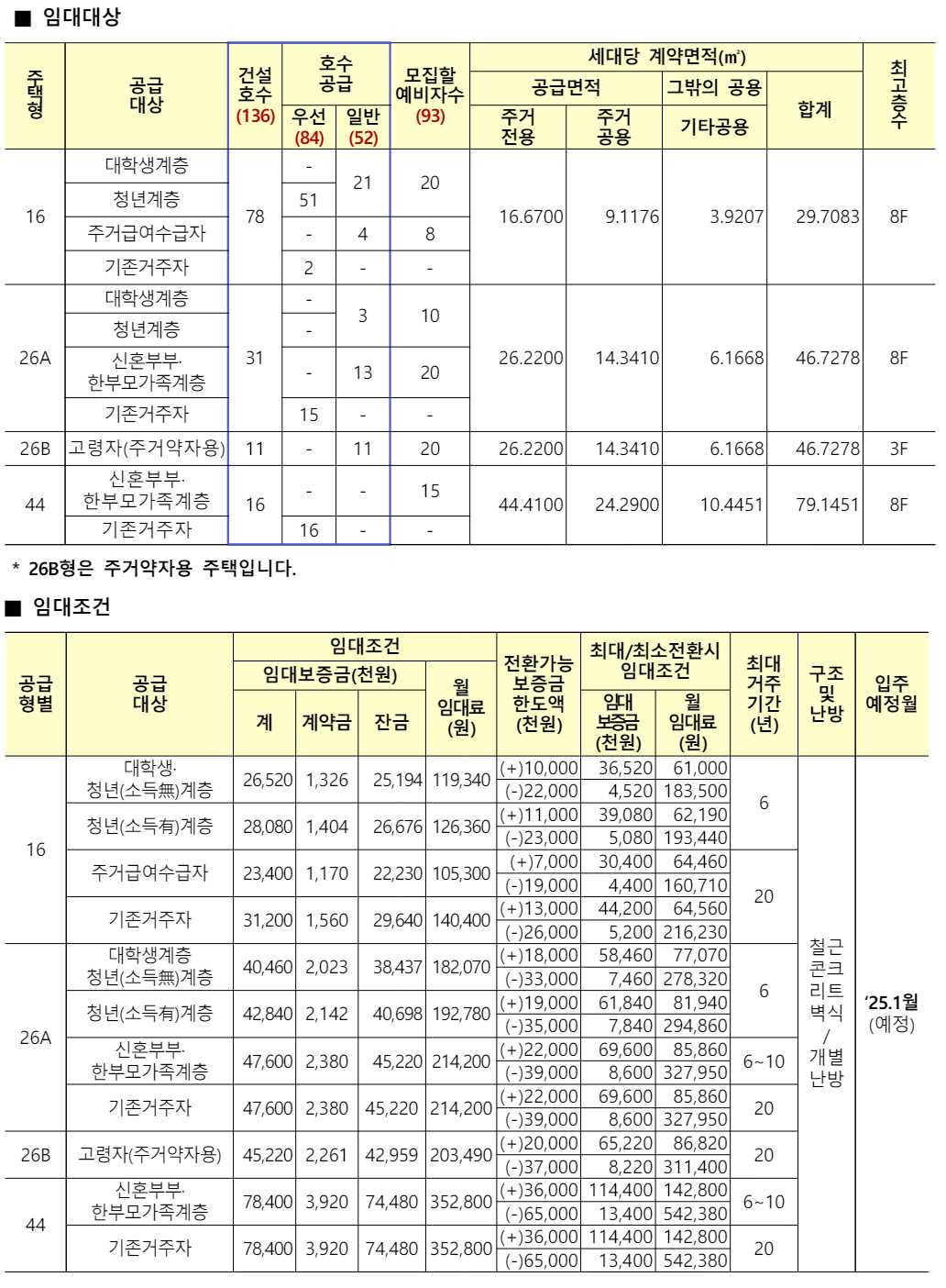 임대보증금 및 월 임대료는 입주자 모집공고일 기준으로 보증금 최대 전환 시 변동될 수 있습니다.