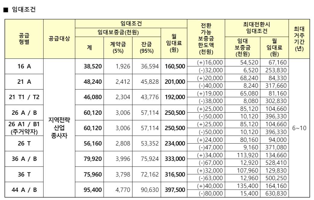 임대보증금 및 월 임대료는 입주자 모집공고일 기준으로 보증금 최대 전환 시 변동될 수 있습니다.