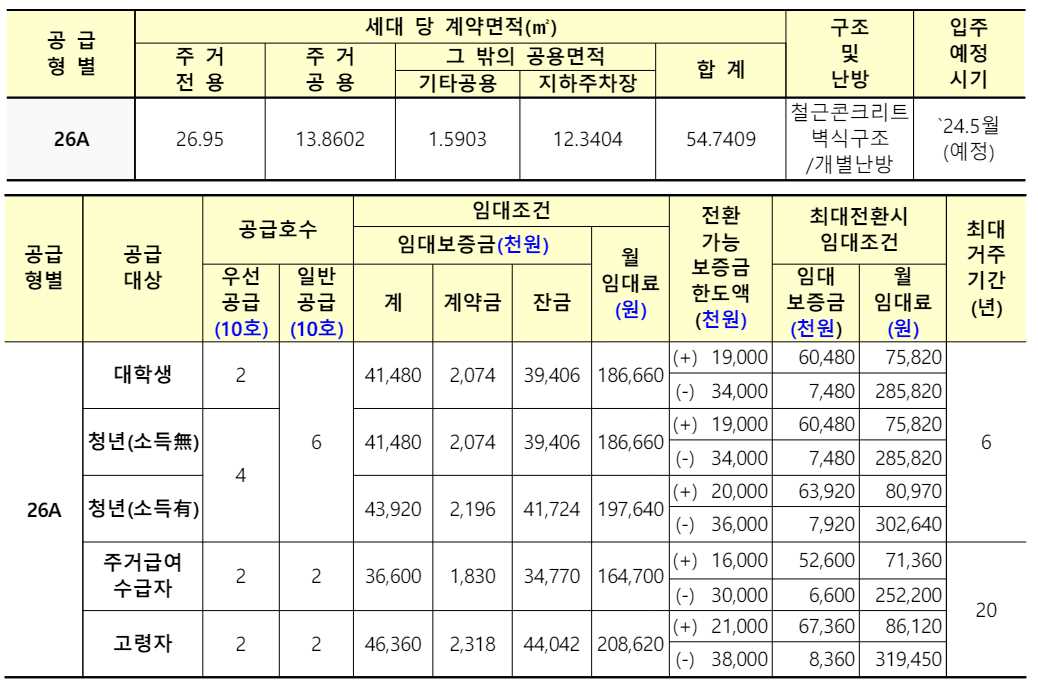 임대보증금 및 월 임대료는 입주자 모집공고일 기준으로 보증금 최대 전환 시 변동될 수 있습니다.