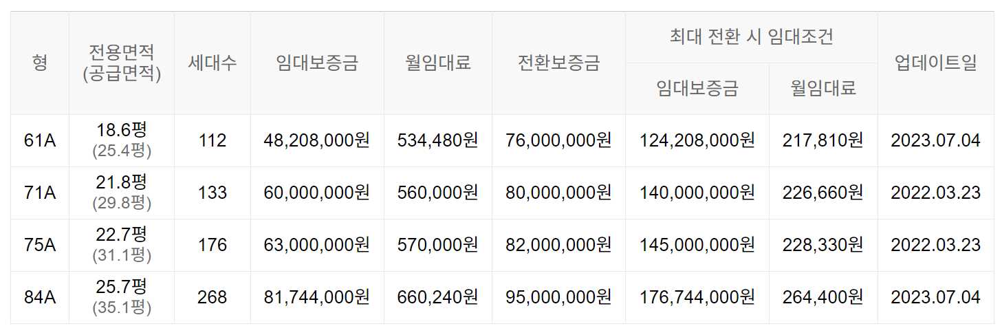 임대보증금 및 월 임대료는 입주자 모집공고일 기준이며, 보증금 최대 전환 시 변동될 수 있습니다.