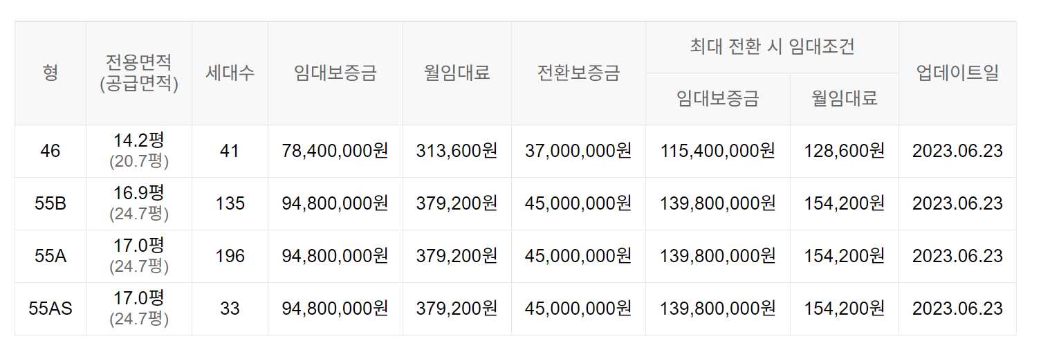 임대보증금 및 월 임대료는 입주자 모집공고일 기준으로 보증금 최대 전환 시 변동될 수 있습니다.