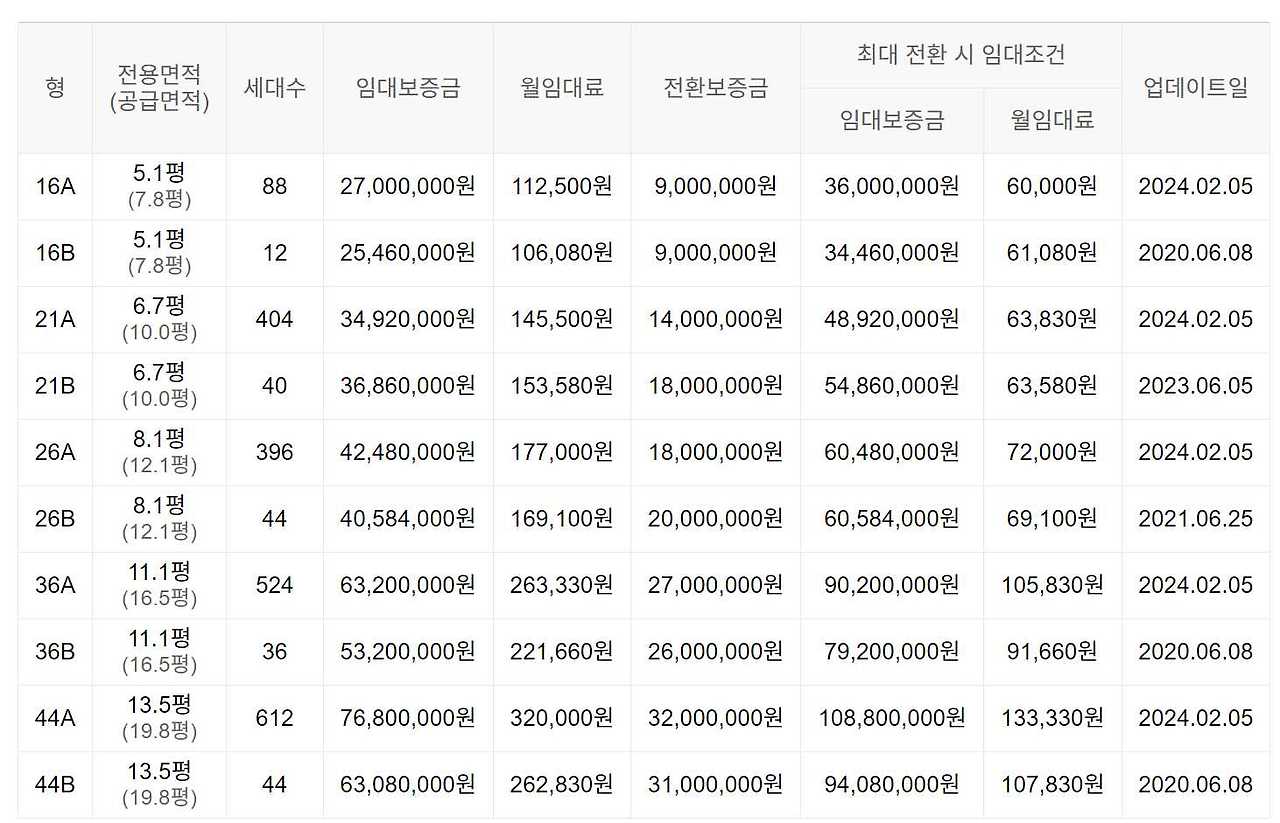 임대보증금 및 월 임대료는 입주자 모집공고일 기준으로 보증금 최대 전환 시 변동될 수 있습니다.