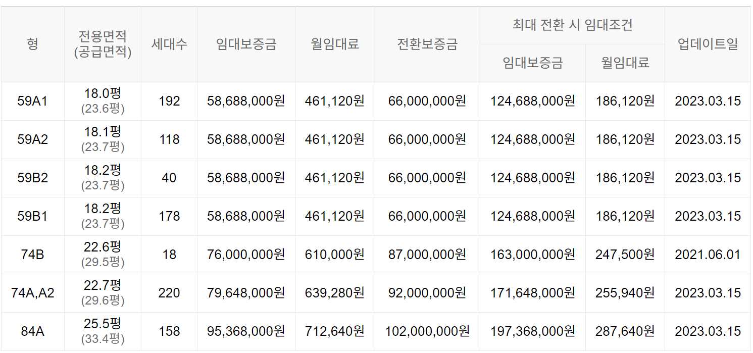 임대보증금 및 월 임대료는 입주자 모집공고일 기준이며, 보증금 최대 전환 시 변동될 수 있습니다.