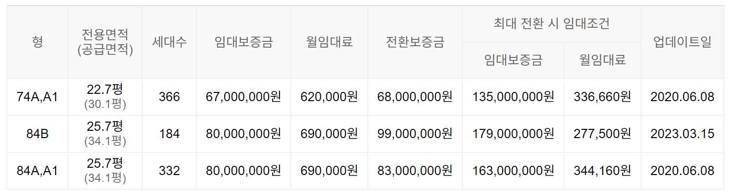 임대보증금 및 월 임대료는 입주자 모집공고일 기준이며, 보증금 최대 전환 시 변동될 수 있습니다.